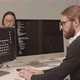 Side-view waist up slowmo shot of IT specialist sitting at desk in office typing program code on PC talking to Asian colleague