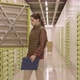 Locked-down of young female Caucasian manager walking out from storage unit, checking contents of lot across hall, taking notes