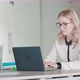 focused businesswoman working in office adult woman with blond hair wearing in formal shirt typing on laptop