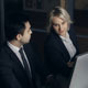 Close up of two coworkers computing in the dark office