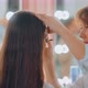 Mascara application, close-up. Makeup artist work with model in beauty studio in front of a large mirror.