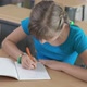 Diligent teenage girl sitting at a separate desk in school and doing sums in her workbook during math exam. Blond braided girl in blue t-shirt doing a math test or solving equitation at math lesson. This footage illustrates high school, classwork, exam, lesson, pre-study courses. You can use the video for commercials, reporting, music clips, advertising, etc.