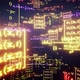 One perfectly seamlessly looped video animation clip of a clean smooth rotating camera around neon glowing mathematic formulas, data, schedules and equations, math problems, flying by in 3D space.