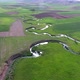 A meander is one of a series of regular sinuous curves, bends, loops, turns, or windings in the channel of a river, stream, or other watercourse. Meanders are produced by a brook or rivers as it erodes the sediments comprising an outer concave cut bank and deposits this and sediment downstream on an inner, convex which is typically a point bar. The zone within which a meandering creek shifts its channels across either its floodplain or valley floor from time is known as a water belt. Aerial view grassland prairie moorland lowland meadow wold pasture plateaus plain plateau tableland steppe brown green field plantation arable cultivable background landscape nature natural fly flight flying overhead bright true simple standard 4K UHD 3840X2160