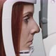 Closeup of young red-haired woman having eye refraction test during routine eye examination