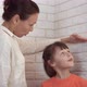 Measuring height by wall. A woman puts her little girl by the wall and measure the height during her childhood.