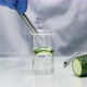 Medical scientist specialist putting a piece of cucumber in flask, adding solution in food laboratory. Genetic Modifications of Product. Microbiologist analyzing half-cut lab-grown cucumber.