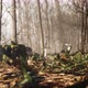 The helmets of a medieval knight and a Viking lie at the site of the final battle in the middle of the forest with a sword stuck in the ground. Medieval armor lies on the battlefield. The animation is for historical or military backgrounds.