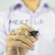 Man, web developer, entrepreneur, creative designer, freelancer writes and draws on transparent wall : Meet Up