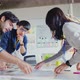 Meeting of UX developer and UI designer brainstorming about mobile app interface workflow design on table with coworker breif and color code at co-working space.Creative digital development agency.