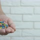 Microplastic. A female pour a crushed plastic in her hand in the room.