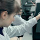 Close up of scientist putting sample under microscope and inspecting it on the screen of computer