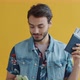 Middle Eastern tourist hoding passport with plane tickets and using smartphone touching screen on yellow color background. People and vacation concept.