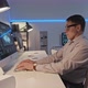 Tracking shot of middle-aged male engineer in glasses sitting at desk in office and looking at holographic car model and data on computer screen