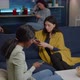Mixed race friends sitting on sofa holdings mobile in hands browsing on internet, watching online video during relaxing party. Group of multi-ethnic hanging out together spending time in living room