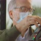 Modern payment method. Customer paying by NFC technology in mobile phone. Wearing protective face mask.