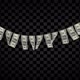 Hundred dollar bills are dried on a string. Appearance and disappearance from the top of the screen. Transparent background.