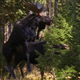 A close up tracking shot of a bull moose trying to mount a reluctant cow in the autumn sun during the rut Greater Yellowstone Ecosystem, Wyoming Alces alces shirasi