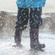 Boy and girl having fun on a rainy day jumping and dancing in puddle
