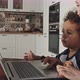 Close-up side view of young Caucasian woman with little Black son in hands sitting at table at home, using portable computer
