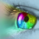 The human eye close-up. On the iris ring is rotated, colored in seven basic colors (red, orange, yellow, green, blue, indigo, violet). After blinking of eye, rotating ring generates a multicolor moving light rays