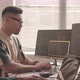 Side view slowmo of young Black woman and her Asian male colleague writing program codes on computers while developing new software in office