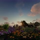 Beautiful nature, forest and meadow with insects and birds, flowers, green grass and a shining sunrise.
