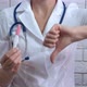 Negative express test. A view of medical worker in white coat with negative express test and show the thumb down.