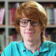 Tilt up of a nerdy guy in eyeglasses doing homework and listening to music