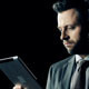 Side view of male head and shoulders, his using digital tab