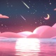 Looped beautiful pastel pink and purple ocean scene with colorful shooting stars, glowing yellow crescent moon, and cumulus clouds in the night sky animation.