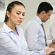 Serious office worker typing on a keyboard with her colleagues discussing business matters in the background