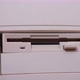Old computer with disk drive. Shooting the process of removing a floppy disk, close up. Retro computer