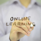 Man, teacher, student, professor writes on transparent wall : Online Learning