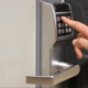 A girl opens a door with a code.
