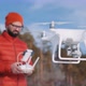 Male hipster in red hat and jacket launches a quadrocopter in an open space. Man in glasses controls the copter, using radio-controlled control panel. Operator makes an areial photo using a drone