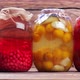 Organic compotes. Canned fruit drinks in glass jars. Delicious drinks.