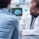 Over the shoulder shot of medical scientist showing to patient a 3D brain simulation on the computer screen