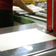 Printing factory worker packing piles of freshly printed newspapers with the help of technology
