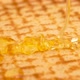 Pancake Texture Rotating Background With Liquid Honey Flows on It. Fried Slapjack With Print of Frying Pan. Morning Food Concept