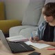 Pandemic e-learning. Boy writes homework, doing exercise online class, drop pencil with annoyed face, tired studying, sulking displeased, sitting in front of laptop on web class, studying with tutor.