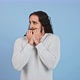 Panic feeling. Studio shot of young nervous stressed man biting his nails, feeling scared and worried, blue background