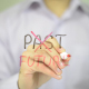 Man, Businessman, entrepreneur, stock trader, analyst or banker writes on transparent wall : Past , Future