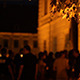 People gathered in nighttime in front of the doors of an old museum building, start entering the building, in line.