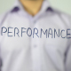 man, businessman, manager, freelancer writes on transparent screen ( surface ) : performance .