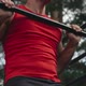 Tilt up of sportive man hanging on monkey bar and doing pull ups outdoor in slow motion