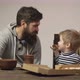 Pizzeria. Dad and kid eating pizza. Italian cuisine. Happy childhood. Fast food dinner lunch