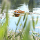 Changing focus from the grass of shore to the plastic objects and dirt that are floating on the lake.