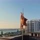 pole dance. fit female gymnast, in beige leotard, performs acrobatic exercises on metal rotating pole, on skyscraper roof, with urban city and sunrise over sea view. morning over the city