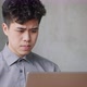 Portrait of pensive asian business man working with laptop solves application problems error in network. Thoughtful young international student korean japanese chinese guy study online at computer. High quality 4k footage